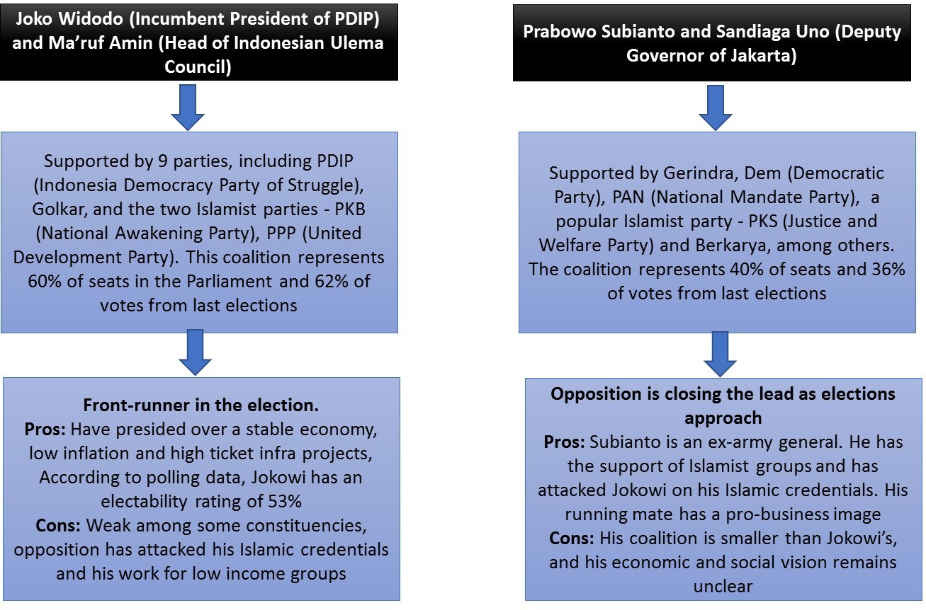 Analysis of polls, track records, and campaign strategies indicate that Jokowi is likely to be re-elected for a second term. However, Jokowi is being challenged on two aspects – neglecting the interests of the poor, and his failure to accommodate hard-line Islamist groups, which have grown vocal in Indonesian politics. The opposition strategy has been to ally with the hardline Islamist groups and use street protests and Islamic identity politics to question Jokowi’s Islamic credentials. This was a strategy the opposition perfected in the 2017 Jakarta gubernatorial elections to oust the incumbent governor of Jakarta, a Christian allied with Jokowi. Jokowi has responded by choosing a conservative cleric, Ma’ruf Amin, as his VP candidate. Amin, the head of the conservative Indonesian Ulema Council (MUI), has spoken out publicly against the minorities, LGBTQ rights, and the values of “liberal secularism.”