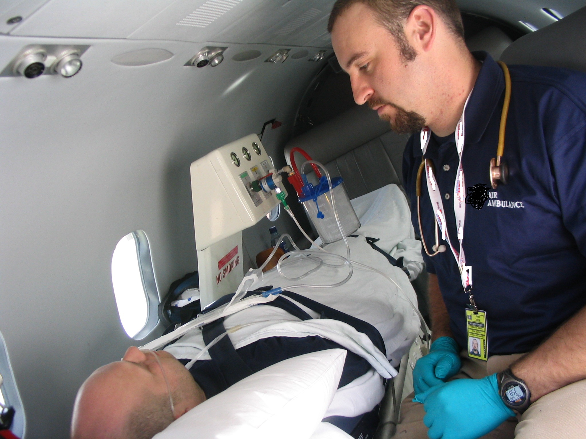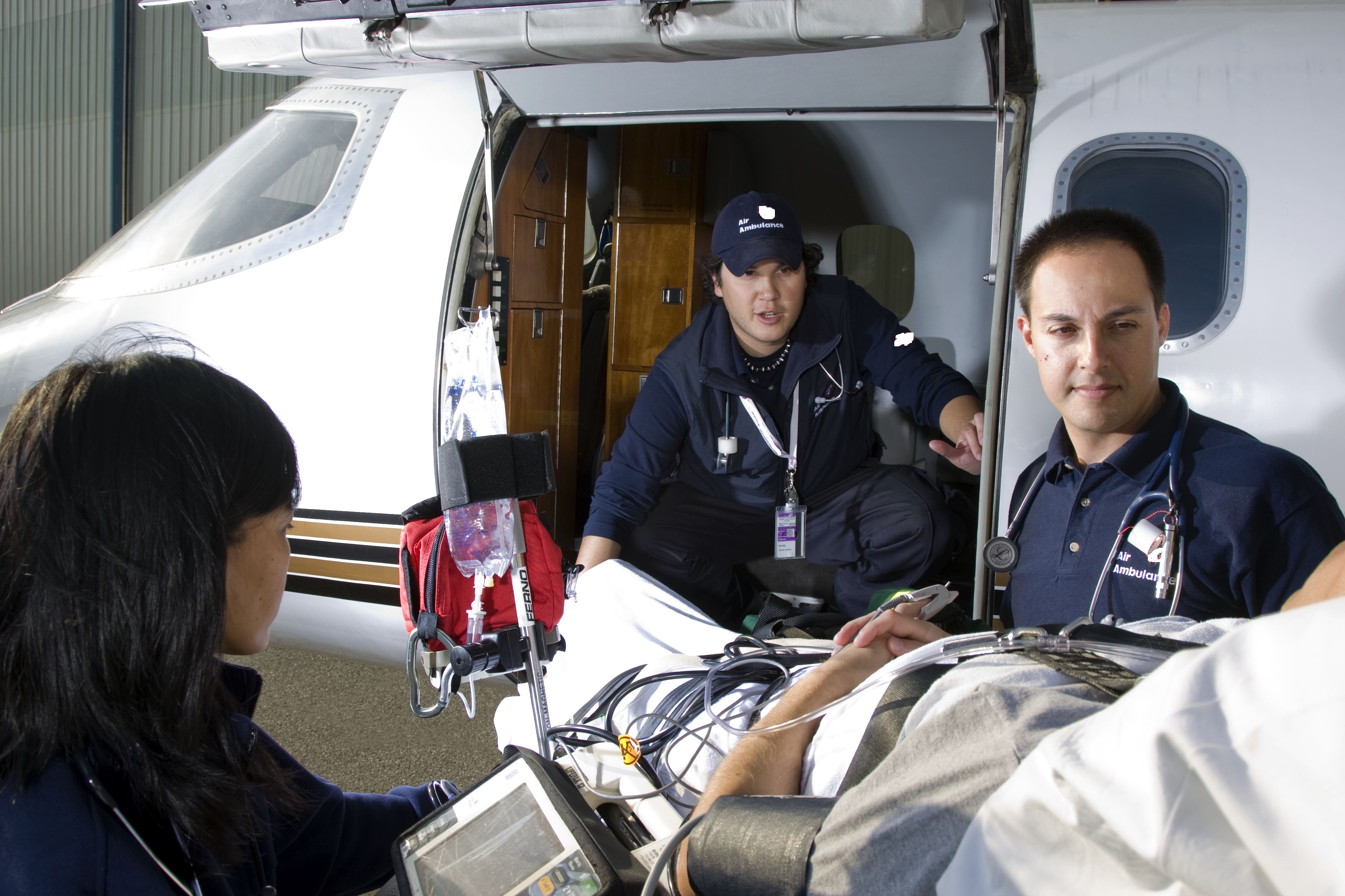 Air ambulance’s medical team tending to patient’s IVs